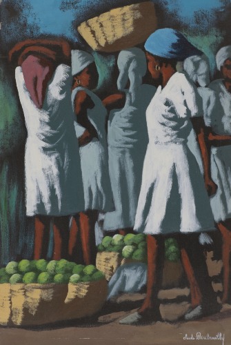 Dambreville is best known for his paintings of Haitian women at market. His style combines bold, minimalist 2D color blocking, with soft, brush modeling along with a strong use of light and shadow. His more contemporary works have focused on portrait style painting of women, children and musicians